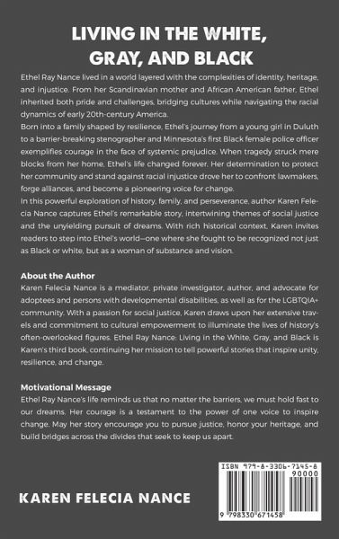 Ethel Ray Nance lived in a world layered with the complexities of identity, heritage, and injustice. From her Scandinavian mother and African American father, Ethel inherited both pride and challenges, bridging cultures while navigating the racial dynamics of early 20th-century America. Born into a family shaped by resilience, Ethel's journey from a young girl in Duluth to a barrier-breaking stenographer and Minnesota's first Black female police officer exemplifies courage in the face of systemic prejudice. When tragedy struck mere blocks from her home, Ethel's life changed forever. Her determination to protect her community and stand against racial injustice drove her to confront lawmakers, forge alliances, and become a pioneering voice for change. In this powerful exploration of history, family, and perseverance, author Karen Felecia Nance captures Ethel's remarkable story, intertwining themes of social justice and the unyielding pursuit of dreams. With rich historical context, Karen invites readers to step into Ethel's world-one where she fought to be recognized not just as Black or white, but as a woman of substance and vision.