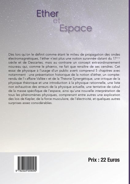 Dès lors qu'on le définit comme étant le milieu de propagation des ondes électromagnétiques, l'éther n'est plus une notion surannée datant du 17ème siècle et de Descartes, mais au contraire un concept extraordinairement nouveau qui, comme le Phoenix, ne fait que renaître de ses cendres. Cet essai de physique à l'usage d'un public averti comprend 5 chapitres avec notamment: une présentation historique de la notion d'éther, un compte-rendu de l'affaire Vallée et de la Théorie Synergétique, une critique de la physique théorique et une introduction à la physique rationnelle, une liste non exhaustive des erreurs de la physique actuelle, une tentative de calcul de la masse volumique de l'espace, sans compter une nouvelle interprétation de tous les phénomènes physiques, comprenant entre autres une explication des lois de Kepler, de la force musculaire, de l'électricité, et quelques surprises assez considérables.