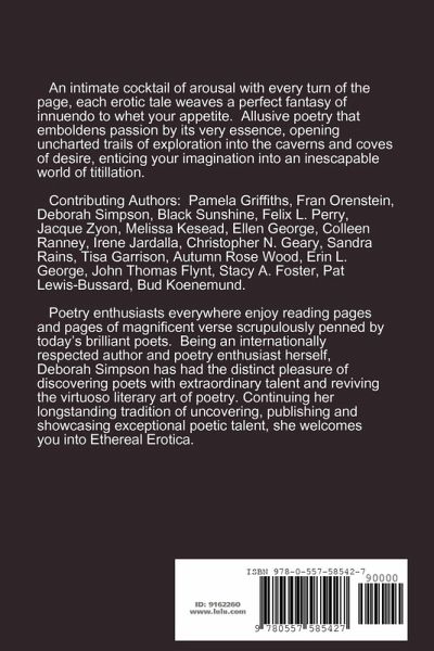 An intimate cocktail of arousal with every turn of the page, each erotic tale weaves a perfect fantasy of innuendo to whet your appetite. Allusive poetry that emboldens passion by its very essence, opening uncharted trails of exploration into the caverns and coves of desire, enticing your imagination into an inescapable world of titillation. Contributing Authors: Pamela Griffiths, Fran Orenstein, Deborah Simpson, Black Sunshine, Felix L. Perry, Jacque Zyon, Melissa Kesead, Ellen George, Colleen Ranney, Irene Jardalla, Christopher N. Geary, Sandra Rains, Tisa Garrison, Autumn Rose Wood, Erin L. George, John Thomas Flynt, Stacy A. Foster, Pat Lewis-Bussard, Bud Koenemund
