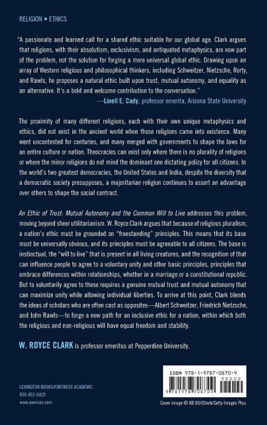 The proximity of many different religions, each with its own unique metaphysics and ethics, did not exist in the ancient world when those religions came into existence. Many went uncontested for centuries, and many merged with governments to shape the laws for the entire people of a culture or nation. Theocracies can exist only where there is no plurality of religions or where the minor religions do not mind the dominant one dictating policy for all citizens. In the word's two greatest democracies, the U.S. and India, despite the diversity that a democratic society presupposes, a majoritarian religion continues to assert an advantage over others to shape the social contract. An Ethic of Trust: Mutual Autonomy and the Common Will-to-Live addresses this problem, moving beyond sheer utilitarianism. W. Royce Clark argues that because of religious pluralism, a nation's ethic must be grounded on "freestanding" principles. This means that its base must be universally obvious, and its principles must be agreeable to all citizens. The base is instinctual, the "will-to-live" which is present in all living creatures, and the recognition of that can influence people to agree to a voluntary unity and a couple of other basic principles to which all would agree, principles which embrace differences within relationships, whether in a marriage or a constitutional republic. But to voluntarily agree to these requires a genuine mutual trust and mutual autonomy which can maximize unity while allowing individual liberties. To arrive at this point, Clark blends scholars who are often cast as opposites-Albert Schweitzer, Friedrich Nietzsche, and John Rawls-to forge a new path for an inclusive ethic for a nation, within which both the religious and non-religious will have equal freedom and stability.