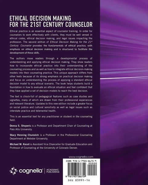 Ethical practice is an essential aspect of counselor training. In order for counselors to work effectively with clients, they must be well versed in ethical codes, ethical decision making, and legal issues impacting the profession. The second edition of Ethical Decision Making for the 21st Century Counselor provides the fundamentals of ethical practice, with emphasis on ethical decision making and is structured to facilitate the development of these skills. The authors move readers through a developmental process of understanding and applying ethical decision making. They show readers how to incorporate ethical practice into their understanding of the counseling process and as well as how to integrate ethical decision-making models into their counseling practice. This unique approach differs from other texts because of its strong emphasis on practical decision making and focus on understanding the process of applying a standard ethical decision model to any ethical scenario. The book helps students build a foundation in how to evaluate an ethical situation and feel confident that they have applied a set of decision models to reach the best decision. The text is chock-full of pedagogical features such as case studies and vignettes, many of which are drawn from their professional experiences and relevant literature. Updates to this new edition include a greater focus on social justice and cultural sensitivity as well as legal issues such as interstate practice and telemental health. This is an essential text for any practitioner or student in the counseling field.