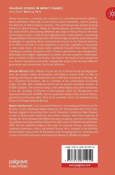 Ethical discourse is commonly not a priority in a conventional finance syllabus. Moral sentiments often take a back seat to market sentiments, even in shaping the direction of ethical finance business. This anomaly persists despite growing interest in ethical finance. Taking an interdisciplinary and diverse perspective, this book enriches the evolving definition and scope of ethical finance literature by focusing on actors, products and regulation that shape markets. Considering the gap between theory and practice, this book bridges academic and professional knowledge in unpacking ethical and governance issues in the financial industry. In an effort to include as many viewpoints as possible, regardless of popularity or who holds them, the book editors gathered thoughts from diverse fields, including accounting, economics, ethics, finance, governance, law, management, philosophy and religion. Appealing to academic and non-academic stakeholders with an interest in ethics and finance,this book is the result of and a testament to a distinct educational and public engagement project that included different generations and communities, for future reference.