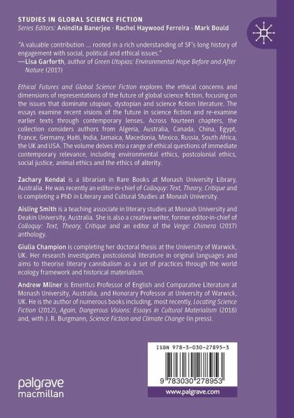 1. Science Fiction's Ethical Modes: Totality and Infinity in Isaac Asimov's Foundation Trilogy and Yevgeny Zamyatin's (We), Zachary Kendal.- 2. Inversion and Prolepsis: Begum Rokeya Sakhawat Hossain's Feminist Utopian Strategies, Sreejata Paul.- 3. Better Societies for the Ethical Treatment of Animals: Vegetarianism and the Utopian Tradition, Joshua Bulleid.- 4. Eutopia, Dystopia and Climate Change, Andrew Milner.- 5. Evolving a New, Ecological Posthumanism: An Ecocritical Comparison of Michel Houellebecq's Les Particules élémentaires and Margaret Atwood's MaddAddam Trilogy, Rachel Fetherston.- 6. The Perverse Utopianism of Willed Human Extinction: Writing Extinction in Liu Cixin's The Three-Body Problem ( ), Thomas Moran.-7. Ecopocalyptic Visions in Haitian and Mexican Landscapes of Exploitation, Giulia Champion.- 8.Postcolonial Science Fiction and the Ethics of Empire, Bill Ashcroft.- 9. The Postcolonial Cyborg in Amitav Ghosh's The Calcutta Chromosome, Nudrat Kamal.- 10. Wagering the Future: Split Collectives and Decolonial Praxis in Assia Djebar's Ombre Sultane and Nalo Hopkinson's Midnight Robber, Lara Choksey.- 11. Rewriting France's Future: From Louis-Sébastien Mercier's Pre-Revolutionary Projections to Michel Houellebecq's Islamic Agendas via Secular State Ethics, Jacqueline Dutton.- 12. The Appearance of Dystopian Fiction in Macedonia and its Ethical Concerns, Kalina Maleska.- 13. Cairo in 2015 and in 2023: The Dreadful Fates of the Egyptian Capital in Jamil Nasir's Tower of Dreams and Ahmed Khaled Towfik's Utopia, Anna Madoeuf & Delphine Pagès-El Karoui.-14. Post-Capitalist Futures: A Report on Imagination, Nick Lawrence.