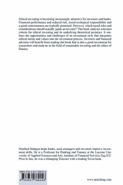 Ethical investing is becoming increasingly attractive for investors and banks. Financial performance and reduced risk, social-ecological responsibility and a good consciousness are typically promised. However, which moral rules and considerations should actually guide an investor? This book analyses selection criteria for ethical investing and its underlying theoretical premises. It outlines the opportunities and challenges of an investment style that integrates ethical norms and values into the investment process. Investors and financial advisors will benefit from reading this book that is also a good investment for researchers and analysts in the field of sustainable investing and the ethics of finance.