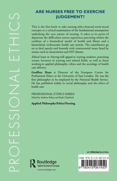 Introduction, Geoffrey Hunt Part 1 Specific issues Chapter 1 Nursing and informed consent, Deborah Taplin Chapter 2 The observation of intimate aspects of care, Paul Wainwright Chapter 3 Choice and risk in the care of elderly people, Linda Smith Chapter 4 Caring for patients who cannot or will not eat, Julie Fenton Chapter 5 Disabled people and the ethics of nursing research, Maddie Blackburn Chapter 6 Ethical issues in HIV/AIDS epidemiology, Ann Kennedy Part 2 General issues Chapter 7 Nursing accountability, Geoffrey Hunt Chapter 8 The value of codes of conduct, Andrew Edgar Chapter 9 In the patient's best interests, Ann P. Young Chapter 10 Nursing and the concept of care, Linda Hanford Chapter 11 'Medical judgement' and the right time to die, Anne Maclean Chapter 12 Nurse time as a scarce health care resource, Donna Dickenson
