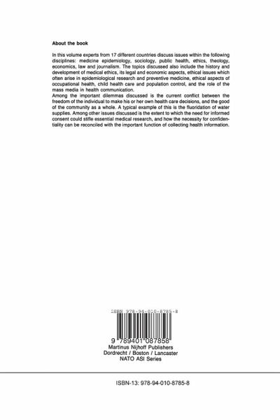 The first suggestions and exchange of ideas for this Workshop began about two years ago when, at the invitation of Professor E Bennett, Director of Health and Safety of the Commission of the European Communities and Professor W W Holland of the Panel of Social Medicine and Epidemiology of the EEC, I asked the Panel to sponsor a project for the study of Ethical Issues in Preventive Medicine. The Panel gave its approval and support and asked Dr L Karhausen, Dr R Blaney, and me to undertake the planning. Since then we have had several meetings in Brussels and have added Professor Heleen Terborgh-Dupuis and Mrs Susie Stewart to our small planning team. The Planning Committee invited many experts to collaborate with us on the project and, as can be seen from the list of participants, they represent many scientific disciplines and many countries. About a year ago we also asked for the help and sponsorship of the NATO Science Council which was generously given. The culmination of our efforts was the Workshop held in Athens in January 1985, the proceedings of which are contained in the present book. The members of the Planning Committee and the participants at the Workshop would like to express thanks to Mr H Durand, Secretary General for NATO Scientific Affairs and Dr M di Lullo, Programme Director of N A TO Scientific Affairs and to Professor Bennett and Professor Holland for all the moral and financial support they have given to this project.