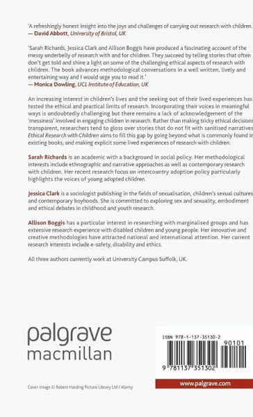 Sarah Richards is a Senior Lecturer at University Campus Suffolk, UK. Her research interests include ethnographic approaches to research, intercountry adoption policy, and stories and narratives of belonging. She has worked most recently producing a working paper on children's best interests for proposed amendments to the Hague Convention of Intercountry Adoption 2015. Jessica Clark is a Senior Lecturer at University Campus Suffolk, UK. She is a sociologist publishing in the fields of sexualisation, children's sexual cultures and contemporary boyhoods. Jessica is committed to sex and sexuality, embodiment and ethical debates in childhood and youth research. Allison Boggis is Senior Lecturer at University Campus Suffolk, UK. She has a particular interest in researching with marginalized groups and has extensive research experience with disabled children and young people. Her innovative and creative methodologies have attracted national and internationalattention. Her current research interests include e-safety, disability and ethics.