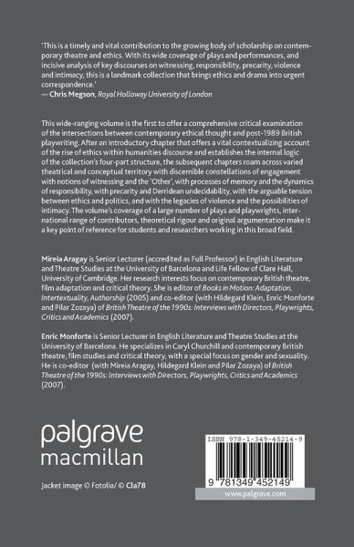 'This is a timely and vital contribution to the growing body of scholarship on contemporary theatre and ethics. With its wide coverage of plays and performances, and incisive analysis of key discourses on witnessing, responsibility, precarity, violence and intimacy, this is a landmark collection that brings ethics and drama into urgent correspondence.' - Chris Megson, Royal Holloway University of London