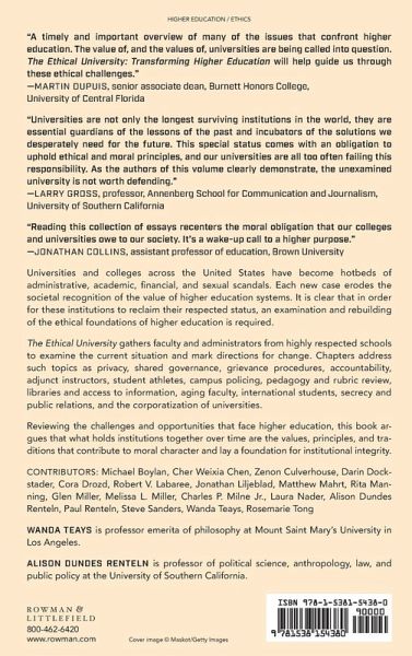 Acknowledgements Preface Wanda Teays PART I: ETHICAL FRAMEWORKS 1. Scandals and Historic Injustices at Universities: An Argument for Greater Accountability Alison Dundes Renteln 2. Ethical Foundations For Institutional Integrity Wanda Teays 3. Privacy, Play, and the Digitalization of the University Glen Miller and Cora Drozd PART II: THE COMMUNITY 4. Shared Governance in Higher Education Darin Dockstader, Matthew Mahrt, and Charles Milne 5. Academic Libraries: Advocating for an Ethical University Robert V. Labaree and Melissa L. Miller 6. The Use of Adjuncts in Colleges and Universities Michael Boylan 7. Rights-Based Approaches to the Treatment of Student Athletes Jonathan Liljeblad 8. Campus Policing: What Authority and Limits are Appropriate? Rita Manning PART III: CHALLENGES 9. The Role of the Humanities in Trauma-Informed Pedagogy Zenon Culverhouse 10. Pedagogical Issues: The General Education Challenge Laura Nader 11. Is Your Grading Scale Unfair? Paul Renteln 12. Do Aging Academics Have a Moral Obligation To Retire? Rosemarie Tong 13. Human Rights of International Students in Higher Education: Theory & Practice Cher Weixia Chen 14. Secrecy and The University: A Cautionary Case Study Steve Sanders Appendix: Shared Governance Policies Charles Milne About the Contributors