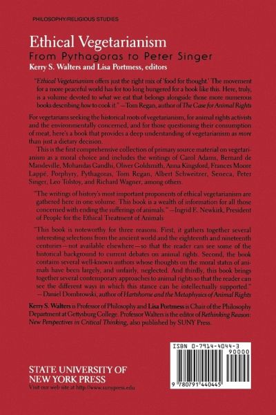 For vegetarians seeking the historical roots of vegetarianism, for animal rights activists and the environmentally concerned, and for those questioning their consumption of meat, here's a book that provides a deep understanding of vegetarianism as more than just a dietary decision. This is the first comprehensive collection of primary source material on vegetarianism as a moral choice and includes the writings of Carol Adams, Bernard de Mandeville, Mohandas Gandhi, Oliver Goldsmith, Anna Kingsford, Frances Moore Lappé, Porphyry, Pythagoras, Tom Regan, Albert Schweitzer, Seneca, Peter Singer, Leo Tolstoy, and Richard Wagner, among others.