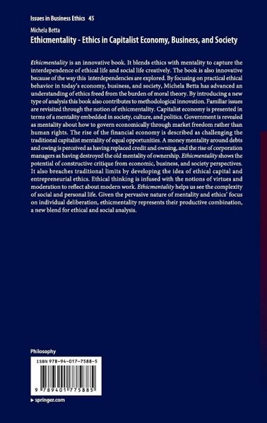 Ethicmentality is an innovative book. It blends ethics with mentality to capture the interdependence of ethical life and social life creatively. The book is also innovative because of the way this interdependence is explored. By focusing on practical ethical behavior in today's economy, business, and society, Michela Betta has advanced an understanding of ethics freed from the burden of moral theory. By introducing a new type of analysis this book also contributes to methodological innovation. Familiar issues are revisited through the notion of ethicmentality. Capitalist economy is presented in terms of a mentality embedded in society, culture, and politics. Government is revealed as mentality about how to govern economically through market freedom rather than human rights. The rise of the financial economy is described as challenging the traditional capitalist mentality of equal opportunities. A money mentality around debts and owing is perceived as having replaced credit and owning, and the rise of corporation managers as having destroyed the old mentality of ownership. Ethicmentality shows the potential of constructive critique from economic, business, and society perspectives. It also breaches traditional limits by developing the idea of ethical capital and entrepreneurial ethics. Ethical thinking is infused with the Aristotelian notion of virtues and moderation to reflect about modern work. Ethicmentality helps us see the complexity of social and personal life. Given the pervasive nature of mentality and ethics' focus on individual deliberation, ethicmentality represents their productive combination, a new blend for ethical and social analysis.