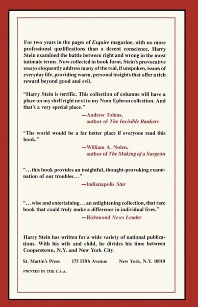For two years in the pages of Esquire magazine, with no more professional qualifications than a decent consience, Harry Stein examined the battle between right and wrong in the most intimate terms. Now collected in book form, Stein's provocative essays eloquently address many of the real, if unspoken, issues of everyday life, providing warm, personal insights that offer a rich reward beyond good and evil.