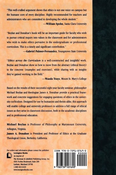 Ethics across the Curriculum is a well constructed and insightful work. Intended for faculty and administrators, this text will also appeal to business ethicists, legal ethicists, and others seeking to better understand and apply ethics. It is nicely structured in a modular approach, so groups as well as individuals can easily put it to use. The presentation of concepts is clear and to the point. The applications and analyses benefit from the different perspectives of philosophy (Michael Boylan) and theology (James Donahue). Their thoughtful way of writing helps us see how ethics-as "the reflection on the good"-penetrates all disciplines. Though aimed at the assessment of university curricula, this book provides an overview of ethics and its benefit for different areas of our lives. The pedagogical aspects of the book, such as how to create vocational autobiographies, will be especially helpful. Boylan and Donahue show us how to move from the abstract (ethical theory) to the concrete (examples and exercises), while sharing with us insights they've gained working in the field. -- Wanda Teays, Mount St. Mary's College, Los Angeles This well-crafted argument shows that ethics is not one voice on campus but the humane core of every discipline. It shows how every academic discipline and professional program is accountable to our humanity and the common good of society. Highly recommended for teachers and administrators who are committed to developing the whole student. -- William Spohn, Santa Clara University Ethics across the Curriculum belongs in a tradition of liberal arts that goes back to the earliest American colleges. Even when ethics fell from its unique place in the curriculum, it gradually reappeared, asserting its importance to the development of the student's conscience and ways of knowing the good. As we now rethink the place of ethics in our colleges and universities, Boylan and Donahue's book will be an important guide for faculty who wish to pursue the critical inquiry into values in the classroom, and for administrators who wish to make ethics pervasive in the undergraduate or professional curriculum. This is a timely and significant contribution. -- Gabriel Palmer-Fernandez, Youngstown State University