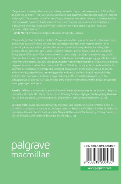 Ethics and Affects in the Fiction of Alice Munro explores the representation of embodied ethics and affects in Alice Munro's writing. The collection illustrates how Munro's short stories powerfully intersect with important theoretical trends in literary studies, including affect studies, ethical criticism, age studies, disability studies, animal studies, and posthumanism. These essays offer us an Alice Munro who is not the kindly Canadian icon reinforcing small-town verities who was celebrated and perpetuated in acts of national pedagogy with her Nobel Prize win; they ponder, instead, an edgier, messier Munro whose fictions of affective and ethical perplexities disturb rather than comfort. In Munro's fiction, unruly embodiments and affects interfere with normative identity and humanist conventions of the human based on reason and rationality, destabilizing prevailing gender and sexual politics, ethical responsibilities, and affective economies. As these essays make clear, Munro's fiction reminds us of the consequences of everyday affects and the extraordinary ordinariness of the ethical encounters we engage again and again.