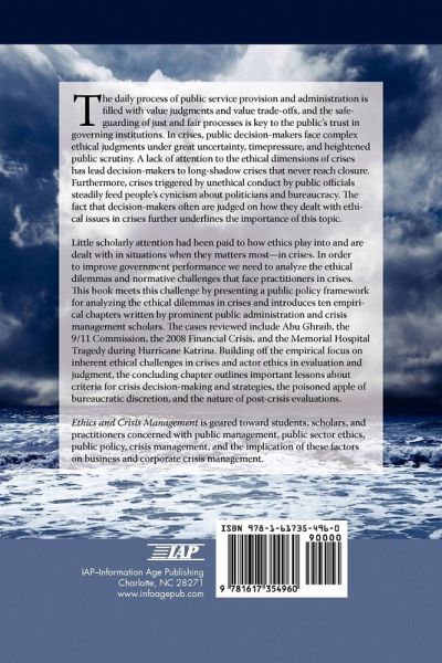 A volume in Ethics in Practice Series Editors Robert A. Giacalone, Temple University and Carole L. Jurkiewicz, Louisiana State University The daily process of public service provision and administration is filled with value judgments and value trade-offs, and the safeguarding of just and fair processes is key to the public's trust in governing institutions. In crises, public decision-makers face complex ethical judgments under great uncertainty, timepressure, and heightened public scrutiny. A lack of attention to the ethical dimensions of crises has lead decision-makers to long-shadow crises that never reach closure. Furthermore, crises triggered by unethical conduct by public officials steadily feed people's cynicism about politicians and bureaucracy. The fact that decision-makers often are judged on how they dealt with ethical issues in crises further underlines the importance of this topic. Little scholarly attention had been paid to how ethics play into and are dealt with in situations when they matters most - in crises. In order to improve government performance we need to analyze the ethical dilemmas and normative challenges that face practitioners in crises. This book meets this challenge by presenting a public policy framework for analyzing the ethical dilemmas in crises and introduces ten empirical chapters written by prominent public administration and crisis management scholars. The cases reviewed include Abu Ghraib, the 9/11 Commission, the 2008 Financial Crisis and the Memorial Hospital Tragedy during Hurricane Katrina. Building off the empirical focus on inherent ethical challenges in crises and actor ethics in evaluation and judgment, the concluding chapter outlines important lessons about criteria for crisis decision-making and strategies, the poisoned apple of bureaucratic discretion, and the nature of post-crisis evaluations. The book is geared toward students, scholars, and practitioners concerned with public management, public sector ethics, public policy, crisis management, and the implication of these factors on business and corporate crisis management.