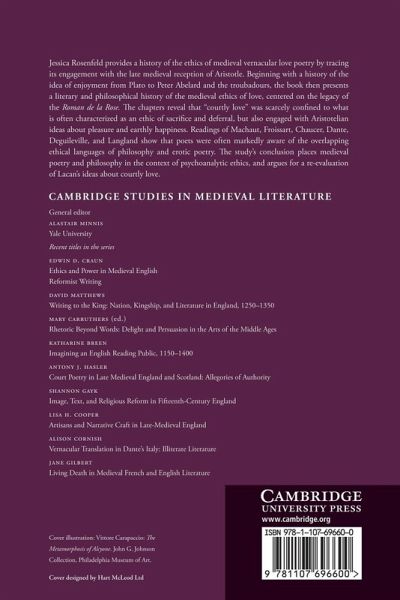 Jessica Rosenfeld provides a history of the ethics of medieval vernacular love poetry by tracing its engagement with the late medieval reception of Aristotle. Beginning with a history of the idea of enjoyment from Plato to Peter Abelard and the troubadours, the book then presents a literary and philosophical history of the medieval ethics of love, centered on the legacy of the Roman de la Rose. The chapters reveal that 'courtly love' was scarcely confined to what is often characterized as an ethic of sacrifice and deferral, but also engaged with Aristotelian ideas about pleasure and earthly happiness. Readings of Machaut, Froissart, Chaucer, Dante, Deguileville and Langland show that poets were often markedly aware of the overlapping ethical languages of philosophy and erotic poetry. The study's conclusion places medieval poetry and philosophy in the context of psychoanalytic ethics, and argues for a re-evaluation of Lacan's ideas about courtly love.