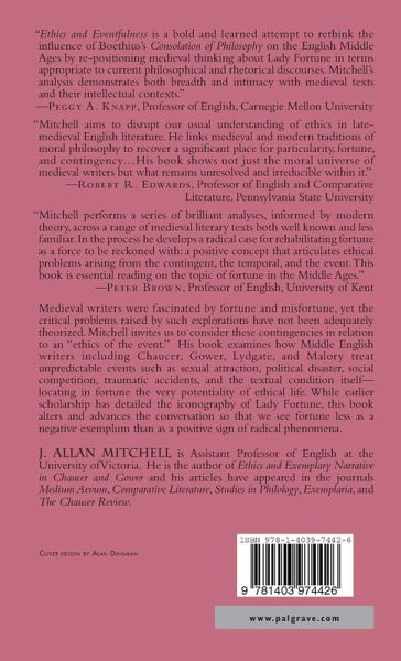 "Ethics and Eventfulness is a bold and learned attempt to rethink the influence of Boethius s Consolation of Philosophy on the English Middle Ages by re-positioning medieval thinking about Lady Fortune in terms appropriate to current philosophical and rhetorical discourses. Mitchell s analysis demonstrates both breadth and intimacy with medieval texts and their intellectual contexts, as he deals with Chaucer, Gower, Usk, Lydgate, Malory, and the little-known Chaunce of the Dyse. His fine grasp of contemporary thought allows him to ptopose some surprising congruences with more current idioms, including theories of eventfulness and moral luck. All of this is presented in a lucid and engaging style." - Peggy A. Knapp, Professor of English at , Carnegie Mellon University