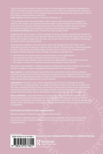 Professor Alan Lawton is Deputy Head of the School of Business and Economics at Monash University, Australia. Prior to joining Monash in 2011 he held professorial appointments at the universities of Hull and Teesside in the UK and VU University in Amsterdam. He has written extensively on public sector ethics in journals such as Journal of Business Ethics, Public Administration Review, Journal of Public Administration Research and Theory, Public Integrity and Public Money & Management Dr Karin Lasthuizen is Associate Professor in Governance Studies and senior member of the research group Quality of Governance at the Department of Governance Studies at the VU University in Amsterdam, the Netherlands. She has recently published in the Public Management Review, Public Administration, Sociological Methods and Research and International Journal of Leadership Dr Julie Rayner is Lecturer in the School of Business and Economics at Monash University, Australia. Prior to joining Monash Julie taught at Durham University, UK and also worked with The Open University Business School. Her research interests are in public sector organizations and she has recently published in the Journal of Public Administration Research and Theory, Journal of Business Ethics and the International Journal of Human Resource Management