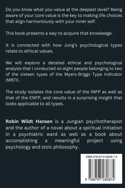 Do you know what you value at the deepest level? Knowing your core value is the key to making life choices that align harmoniously with your inner self. This book presents a way to acquire that knowledge. It is connected with how Jung's psychological types relate to ethical values. I will present you with a detailed ethical and psychological analysis that I conducted on eight people belonging to two of the sixteen types of the Myers-Briggs Type Indicator (MBTI). The study isolates the core value of the INFP as well as that of the ENFP, and results in a surprising insight that looks applicable to all types.