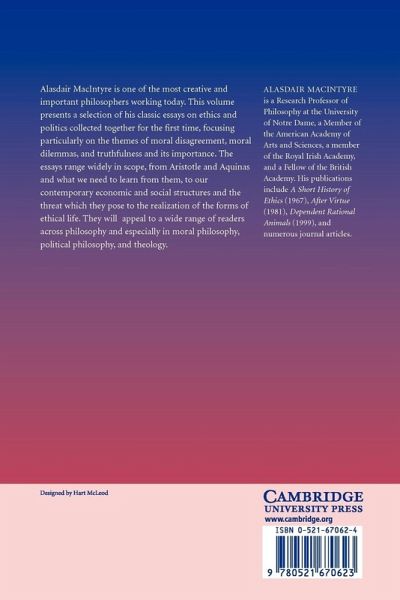 Alasdair MacIntyre is one of the most creative and important philosophers working today. This volume presents a selection of his classic essays on ethics and politics collected together for the first time, focussing particularly on the themes of moral disagreement, moral dilemmas, and truthfulness and its importance. The essays range widely in scope, from Aristotle and Aquinas and what we need to learn from them, to our contemporary economic and social structures and the threat which they pose to the realization of the forms of ethical life. They will appeal to a wide range of readers across philosophy and especially in moral philosophy, political philosophy, and theology.