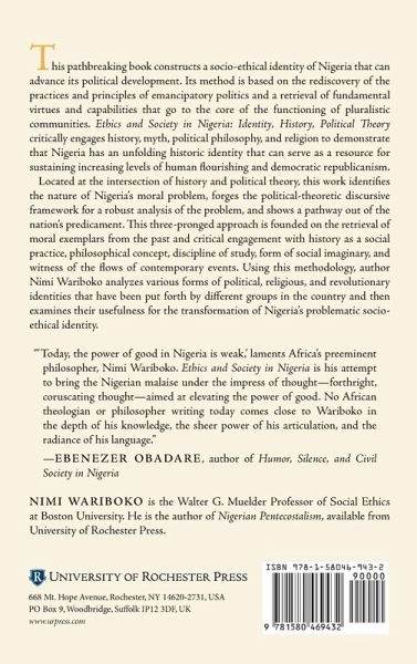 This pathbreaking book constructs a socio-ethical identity of Nigeria that can advance its political development. Its method is based on the rediscovery of the practices and principles of emancipatory politics and a retrieval of fundamental virtues and capabilities that go to the core of the functioning of pluralistic communities. Ethics and Society in Nigeria: Identity, History, Political Theory critically engages history, myth, political philosophy, and religion to demonstrate that Nigeria has an unfolding historic identity that can serve as a resource for sustaining increasing levels of human flourishing and democratic republicanism. Located at the intersection of history and political theory, this work identifies the nature of Nigeria's moral problem, forges the political-theoretic discursive framework for a robust analysis of the problem, and shows a pathway out of the nation's predicament. This three-pronged approach is founded on the retrieval of moral exemplars from the past and critical engagement with history as a social practice, philosophical concept, discipline of study, form of social imaginary, and witness of the flows of contemporary events. Using this methodology, author Nimi Wariboko analyzes various forms of political, religious, and revolutionary identities that have been put forth by different groups in the country and then examines their usefulness for the transformation of Nigeria's problematic socio-ethical identity. NIMI WARIBOKO is the Walter G. Muelder Professor of Social Ethics at Boston University. He is the author of Nigerian Pentecostalism, available from University of Rochester Press.