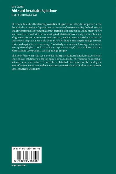 This book describes the alarming condition of agriculture in the Anthropocene, when the ethical conception of agriculture as a service of common utility for both society and environment has progressively been marginalized. The ethical utility of agriculture has been sidetracked with the increasing industrialisation of society, the involvement of agriculture in the business-as-usual economy, and the consequential environmental and societal impacts it has had. Thus, re-establishing a meaningful bridge between ethics and agriculture is necessary. A relatively new science (ecology) with both a new epistemological tool (that of the ecosystem concept), and a unique narrative of sustainable development, can help bridge this gap.