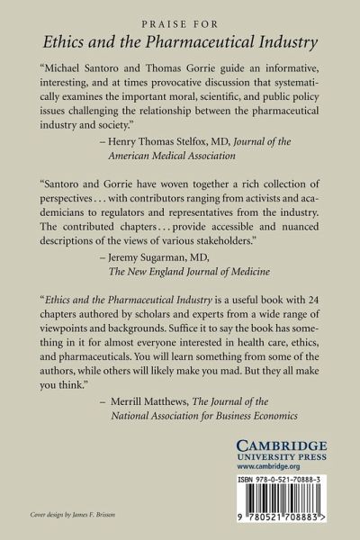 Charting a sustainable path for the 21st century pharmaceutical industry Michael A. Santoro; Part I. Profits, Patients' Rights, and Scientific Progress: The Ethics of Clinical Research Conducted in Private Enterprises: 1. Drug research: between ethical demands and economic constraints Jurgen Drews; 2. Emerging international norms for clinical testing: good clinical trial practice Juhana E. Idanpaan-Heikkila and Sev S. Fluss; 3. The regulatory and ethical challenges of pediatric research M. Dianne Murphy and Sara F. Goldkind; 4. Including children in research: participation or exploitation? Robert M. Nelson; 5. Racial and ethnic inclusiveness in clinical trials Valentine J. Burroughs; 6. The rights of patients to participate in clinical trials Glenna Crooks; 7. How should government regulate stem-cell research? Perspectives of a scientist-legislator The Hon. Rush Holt; Part II. Marketing and the Efficient Utilization of Healthcare Resources: Ethical and Public Policy Challenges: 8. Ethics and prescribing: the clinician's perspective Charles L. Bardes; 9. Direct-to-consumer advertising of prescription drugs: a policy dilemma Meredith B. Rosenthal and Julie M. Donohue; 10. Regulation of prescription drug promotion Thomas Abrams; 11. Off-label communications in marketing prescription drugs Scott D. Danzis; 12. The need for better health information: advancing the informed patient in Europe Don E. Detmer, Peter Singleton and Scott C. Ratzan; 13. Who should get access to which drugs? An ethical template for pharmacy benefits Norman Daniels, James E. Sabin and J. Russell Teagarden; 14. The application of cost-effectiveness and cost-benefit analysis to pharmaceuticals Joel Hay; Part III. Patents, Pricing, and Equal Access: 15. Intellectual property rights, access to life-enhancing drugs, and corporate moral responsibilities Patricia H. Werhane and Michael Gorman; 16. A future agenda for government-industry relations William Weldon; 17. AIDS activism and the pharmaceutical industry Martin Delaney; 18. The campaign against innovation Sidney Taurel; 19. Third world perspectives on global pharmaceutical access James Thuo Gathii; 20. The promise of vaccines and the influenza shortage of 2004: public and private partnerships Gary R. Noble; Part IV. Charting a Sustainable Path for the 21st Century: 21. Evolving approaches to healthcare challenges Thomas M. Gorrie; 22. Property rights in crisis: managers and rescue Nien-he Hsieh; 23. Blurring the lines: public and private partnerships addressing global health William Foege; 24. Renegotiating the grand bargain: balancing prices, profits, people, and principles Greg Koski.