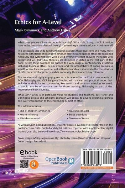 What does pleasure have to do with morality? What role, if any, should intuition have in the formation of moral theory? If something is ‘simulated’, can it be immoral? This accessible and wide-ranging textbook explores these questions and many more. Key ideas in the fields of normative ethics, metaethics and applied ethics are explained rigorously and systematically, with a vivid writing style that enlivens the topics with energy and wit. Individual theories are discussed in detail in the first part of the book, before these positions are applied to a wide range of contemporary situations including business ethics, sexual ethics, and the acceptability of eating animals. A wealth of real-life examples, set out with depth and care, illuminate the complexities of different ethical approaches while conveying their modern-day relevance. This concise and highly engaging resource is tailored to the Ethics components of AQA Philosophy and OCR Religious Studies, with a clear and practical layout that includes end-of-chapter summaries, key terms, and common mistakes to avoid. It should also be of practical use for those teaching Philosophy as part of the International Baccalaureate. Ethics for A-Level is of particular value to students and teachers, but Fisher and Dimmock’s precise and scholarly approach will appeal to anyone seeking a rigorous and lively introduction to the challenging subject of ethics.