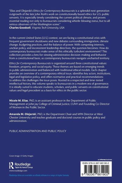 In the current United States (U.S.) context, we are facing a constitutional crisis with frequent government shutdowns and new debates surrounding immigration, climate change, budgeting practices, and the balance of power. With competing interests, unclear policy, and inconsistent leadership directives, the question becomes: How do contemporary bureaucrats make sense of this ethically turbulent environment? This collection provides a lens for viewing administrative decision-making and behavior from a constitutional basis, as contemporary bureaucrats navigate uncharted territory. Ethics for Contemporary Bureaucrats is organized around three constitutional values: freedom, property, and social equity. These themes are based on emerging trends in public administration and balanced with traditional ethical models. Each chapter provides an overview of a contemporary ethical issue, identifies key actors, institutions, legal and legislative policy, and offers normative and practical recommendations to address the challenges the issue poses. Rooted in a respected and time-tested intellectual history, this volume speaks to bureaucrats in a modern era of governance. It is ideally suited to educate students, scholars, and public servants on constitutional values and legal precedent as a basis for ethics in the public sector.