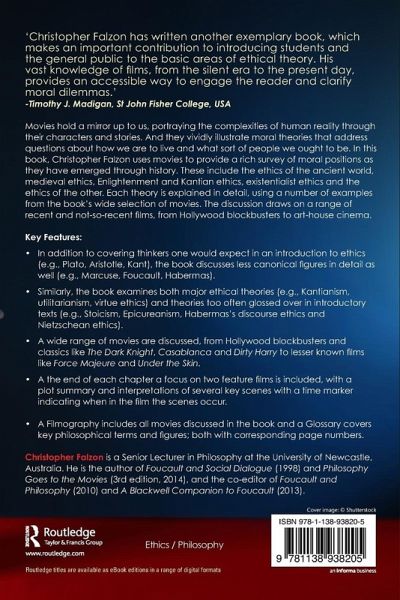 Movies hold a mirror up to us, portraying the complexities of human reality through their characters and stories. And they vividly illustrate moral theories that address questions about how we are to live and what sort of people we ought to be. In this book, Christopher Falzon uses movies to provide a rich survey of moral positions as they have emerged through history. These include the ethics of the ancient world, medieval ethics, Enlightenment and Kantian ethics, existentialist ethics and the ethics of the other. Each theory is explained in detail, using a number of examples from the book's wide selection of movies. The discussion draws on a range of recent and not-so-recent films, from Hollywood blockbusters to art-house cinema.