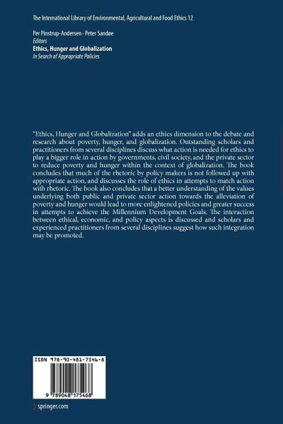 "Ethics, Hunger and Globalization" adds an ethics dimension to the debate and research about poverty, hunger, and globalization. Outstanding scholars and practitioners from several disciplines discuss what action is needed for ethics to play a bigger role in action by governments, civil society, and the private sector to reduce poverty and hunger within the context of globalization. The book concludes that much of the rhetoric by policy makers is not followed up with appropriate action, and discusses the role of ethics in attempts to match action with rhetoric. The book also concludes that a better understanding of the values underlying both public and private sector action towards the alleviation of poverty and hunger would lead to more enlightened policies and greater success in attempts to achieve the Millennium Development Goals. The interaction between ethical, economic, and policy aspects is discussed and scholars and experienced practitioners from several disciplines suggest how such integration may be promoted.