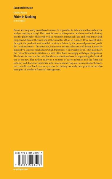 Banks are frequently considered usurers. Is it possible to talk about ethics when you analyse banking activity? This book focuses on this question and starts with the history and the philosophy. Philosophers like Aristotle, Immanuel Kant and John Stuart Mill proposed different theories about the need for ethics in finance. If we accept Mill's thought, the production of wealth in society is driven by the personal pursuit of profit. But - unfortunately - this does not, on its own, ensure collective well-being. It must be guided by a superior mechanism which transforms it into wealth for all. This introduces the role of financial institutions, which often have to comply with legal obligations. The book focuses on the role that these institutions have in supporting the 'ethical' use of money. The author analyses a number of cases in banks and the financial industry and discusses topics like anti-money laundering, anti-usury, islamic finance, microcredit and bank rescue systems, including not only best practices but also examples of unethical financial management.
