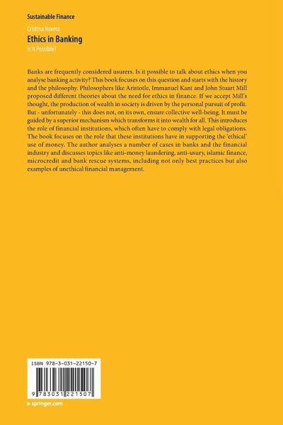 Banks are frequently considered usurers. Is it possible to talk about ethics when you analyse banking activity? This book focuses on this question and starts with the history and the philosophy. Philosophers like Aristotle, Immanuel Kant and John Stuart Mill proposed different theories about the need for ethics in finance. If we accept Mill's thought, the production of wealth in society is driven by the personal pursuit of profit. But - unfortunately - this does not, on its own, ensure collective well-being. It must be guided by a superior mechanism which transforms it into wealth for all. This introduces the role of financial institutions, which often have to comply with legal obligations. The book focuses on the role that these institutions have in supporting the 'ethical' use of money. The author analyses a number of cases in banks and the financial industry and discusses topics like anti-money laundering, anti-usury, islamic finance, microcredit and bank rescue systems, including not only best practices but also examples of unethical financial management.