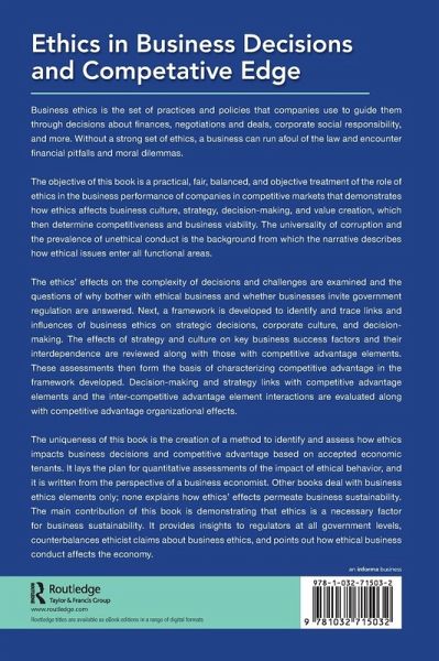 The uniqueness of this book is the creation of a method to identify and assess how ethics impacts business decisions and competitive advantage based on accepted economic tenants. It lays the plan for quantitative assessments of the impact of ethical behavior, and it is written from the perspective of a business economist. Other books deal with business ethics elements only; none explains how ethics' effects permeate business sustainability. The main contribution of this book is demonstrating that ethics is a necessary factor for business sustainability. It provides insights to regulators at all government levels, counterbalances ethicist claims about business ethics, and points out how ethical business conduct affects the economy.