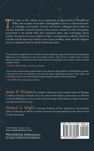 The essays in this volume are an expression of appreciation of Wendell Lee Willis, who recently retired after a distinguished career as a classroom teacher, colleague, and scholar. Current and former colleagues have written to advance Wendell's research interests in the various contexts of early Christianity, particularly in the apostle Paul, New Testament ethics, and ecclesiology. Essays include discussions of issues related to Paul's correspondence with the church in Corinth and the depiction of Paul in Acts, Jesus's parables, meals, and the religious and socio-political world in which Christianity arose. ""An informative, exegetically rich collection of essays exploring a range of ethical issues by relating the biblical text to its historical, social, and ecclesial contexts. This will be a valuable asset to serious biblical interpreters who practice their craft in classrooms and pulpits, and it honors a scholar who has excelled at both."" --Carl R. Holladay, Candler School of Theology ""This excellent volume brings together fifteen essays that are a fitting tribute to Wendell Willis's academic focal points. There are important essays here for anyone sharing his interests in Paul, ethics, and ecclesiology, with an eye to archaeological and sociological studies of early Christianity."" --Allen Black, Harding School of Theology James W. Thompson is Scholar in Residence at the Graduate School of Theology at Abilene Christian University. He is the author of the Paideia commentaries on Hebrews (2008) and Philippians (2016); and The Church according to Paul: Rediscovering the Community Conformed to Christ (2014). Richard A. Wright is Associate Professor of New Testament at the Graduate School of Theology at Abilene Christian University. He has published on the cultural world of early Christianity.