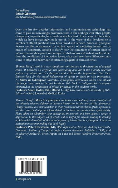 Over the last few decades information and communication technology has come to play an increasingly prominent role in our dealings with other people. Computers, in particular, have made available a host of new ways of interacting, which we have increasingly made use of. In the wake of this development a number of ethical questions have been raised and debated. Ethics in Cyberspace focuses on the consequences for ethical agency of mediating interaction by means of computers, seeking to clarify how the conditions of certain kinds of interaction in cyberspace (for example, in chat-rooms and virtual worlds) differ from the conditions of interaction face-to-face and how these differences may come to affect the behaviour of interacting agents in terms of ethics.