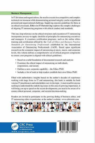 Focusing on how to apply standards to business outsourcing programs, this book provides a one-stop source for the latest information on outsourcing ethics. It includes coverage of certification programs such as the online ethics training and certification offered by the Code of Ethics and Business Practice Standards for Outsourcing Professionals established by the International Association of Outsourcing Professionals. The text incorporates an easy-to-apply checklist in the context of ethical principles for outsourcing executives and managers. The author also defines a comprehensive set of ethical program components.