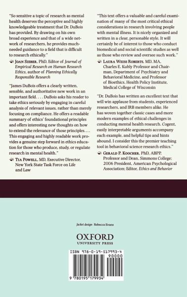 * Introduction: Why Focus on Mental Health Research? * 1: Ethics and Regulatory Compliance: Competing or Complementary Approaches? * 2: An Ethical Framework for Research * 3: Solving Ethical Problems: Analyzing Ethics Cases and Justifying Decisions Case Study: Willowbrook Revisited * 4: Informed Consent Case Study: Withholding information on study purpose * 5: Decision-Making Capacity and the Involvement of Surrogates Case Study: Questionable capacity Case Study: Waiving parental permission * 6: Thinking about Harms and Benefits Case Study: A study of suicidality with at-risk teens * 7: Justice in Recruitment and Research Case Study: Reimbursing participants for their time in a psychotherapy trial Case Study: Biological studies of aggressive behavior in preteens * 8: Research Questions and Study Design Case Study: The ethics of placebo controls * 9: Protecting Privacy and Confidentiality Case Study: Confidentiality and mandatory reporting * 10: Identifying and Managing Conflicts of Interest Case Study: Multiple illustrative vignettes