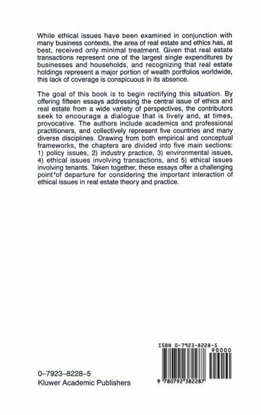 ethics." Certainly our industry is bound by the formal constraints of law in national, state, and local jurisdictions. What this volume reminds us, however, is that those laws are only as good as the personal "sea of ethics" in which each of us operates. THE ETHICS OF PROPERTY INVOLVEMENTS Stephen E. Roulac The Roulac Group San Rafael, California and Visiting Professor University of Ulster Ethical considerations are a dominant theme in the management literature. As "Ethics and ethical issues surround our liver, ... ethics has become one of the most rapidly growing areas of management research,…mehr