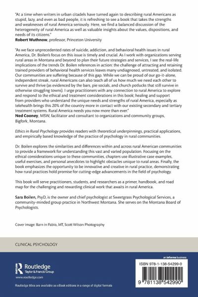 Ethics in Rural Psychology provides readers with theoretical underpinnings, practical applications, and empirically based knowledge of the practice of psychology in rural communities. Dr. Boilen explores the similarities and differences within and across rural American communities to provide a framework for understanding this vast and varied population. Focusing on the ethical considerations unique to these communities, chapters use illustrative case examples, useful exercises, and personal anecdotes to highlight obstacles unique to rural areas. Finally, the book emphasizes the opportunity to be innovative and creative in rural practice, demonstrating how rural practices hold promise for cutting-edge advancements in the field of psychology. This book will serve practitioners, students, and researchers as a primer, handbook, and road map for the challenging and rewarding clinical work that awaits in rural America.