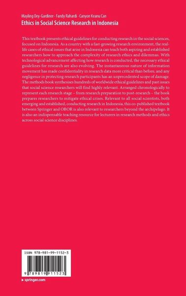This textbook presents ethical guidelines for conducting research in the social sciences, focused on Indonesia. As a country with a fast-growing research environment, the real-life cases of ethical issues that arise in Indonesia can teach both aspiring and established researchers how to approach the complexity of research ethics and dilemmas. With technological advancement affecting how research is conducted, the necessary ethical guidelines for research are also evolving. The instantaneous nature of information movement has made confidentiality in research data more critical than before, and any negligence in protecting research participants has an unprecedented scope of damage. The methods book synthesises hundreds of worldwide ethical guidelines and past issues that social science researchers will find highly relevant. Arranged chronologically to represent each research stage-from research preparation to post-research-the book prepares researchers to mitigate ethical crises. Relevant to all social scientists, both emerging and established, conducting research in Indonesia, this co-published textbook between Springer and OBOR is also relevant to researchers beyond the archipelago. It is also an indispensable teaching resource for lecturers in research methods and ethics across social science disciplines.