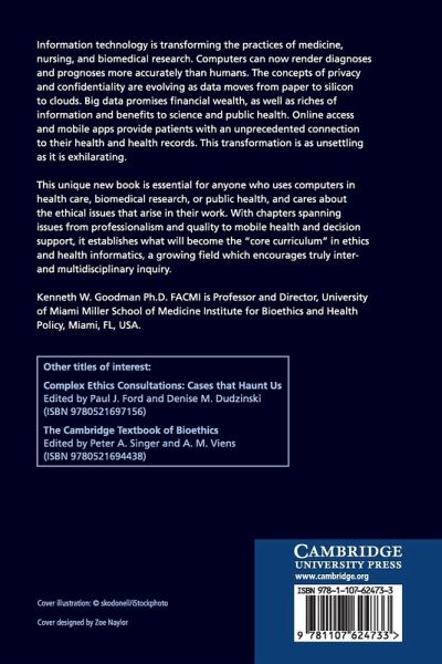 Information technology is transforming the practices of medicine, nursing, and biomedical research. Computers can now render diagnoses and prognoses more accurately than humans. The concepts of privacy and confidentiality are evolving as data moves from paper to silicon to clouds. Big data promises financial wealth, as well as riches of information and benefits to science and public health. Online access and mobile apps provide patients with an unprecedented connection to their health and health records. This transformation is as unsettling as it is exhilarating. This unique new book is essential for anyone who uses computers in health care, biomedical research or public health, and cares about the ethical issues that arise in their work. With chapters spanning issues from professionalism and quality to mobile health and bioinformatics, it establishes what will become the 'core curriculum' in ethics and health informatics, a growing field which encourages truly inter- and multidisciplinary inquiry.