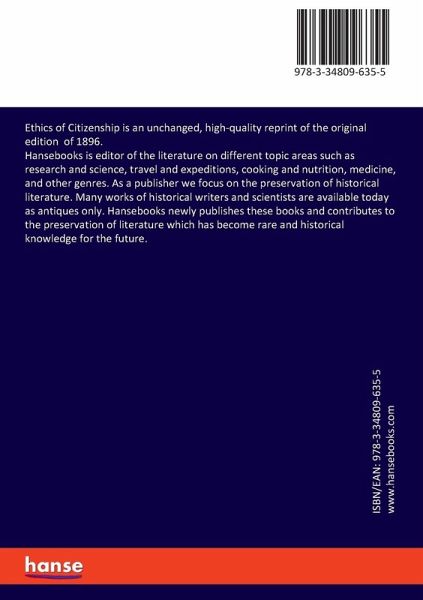 Ethics of Citizenship is an unchanged, high-quality reprint of the original edition of 1896.Hansebooks is editor of the literature on different topic areas such as research and science, travel and expeditions, cooking and nutrition, medicine, and other genres. As a publisher we focus on the preservation of historical literature. Many works of historical writers and scientists are available today as antiques only. Hansebooks newly publishes these books and contributes to the preservation of literature which has become rare and historical knowledge for the future.