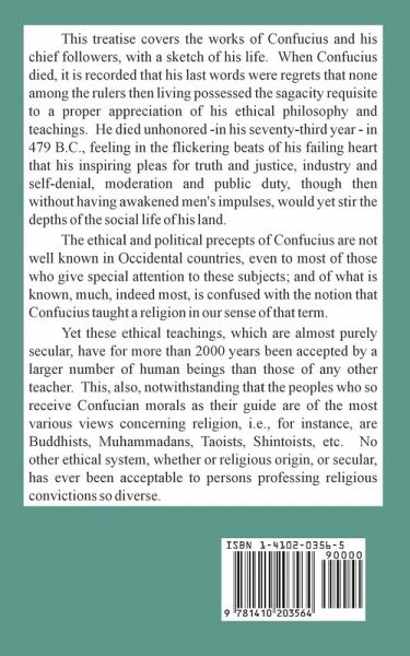 This treatise covers the works of Confucius and his chief followers, with a sketch of his life. When Confucius died, it is recorded that his last words were regrets that none among the rulers then living possessed the sagacity requisite to a proper appreciation of his ethical philosophy and teachings. He died unhonored - in his seventy-third year - in 479 B.C., feeling in the flickering beats of his failing heart that his inspiring pleas for truth and justice, industry and self-denial, moderation and public duty, though then without having awakened men's impulses, would yet stir the depths of the social life of his land. The ethical and political precepts of Confucius are not well known in Occidental countries, even to most of those who give special attention to these subjects; and of what is known, much, indeed most, is confused with the notion that Confucius taught a religion in our sense of that term.Yet these ethical teachings, which are almost purely secular, have for more than 2000 years been accepted by a larger number of human beings than those of any other teacher. This, also, notwithstanding that the peoples who so receive Confucian morals as their guide are of the most various views concerning religion, i.e., for instance, are Buddhists, Muhammadans, Taoists, Shintoists, etc. No other ethical system, whether or religious origin, or secular, has ever been acceptable to persons professing religious convictions so diverse.