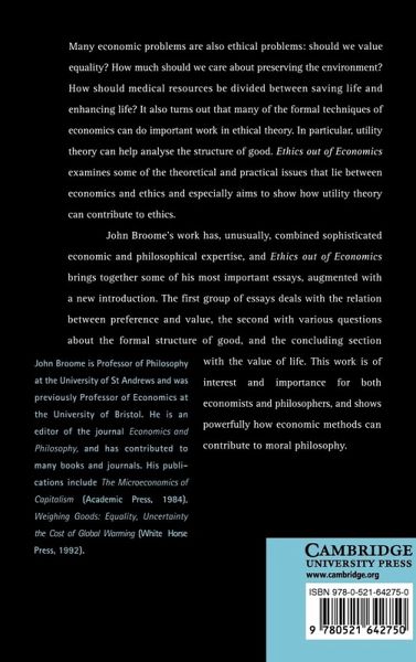 Many economic problems are also ethical problems: should we value economic equality? how much should we care about preserving the environment? how should medical resources be divided between saving life and enhancing life? This book examines some of the practical issues that lie between economics and ethics, and shows how utility theory can contribute to ethics. John Broome's work has, unusually, combined sophisticated economic and philosophical expertise, and Ethics Out of Economics brings together some of his most important essays, augmented with an updated introduction. The first group of essays deals with the relation between preference and value, the second with various questions about the formal structure of good, and the concluding section with the value of life. This work is of interest and importance for both economists and philosophers, and shows powerfully how economic methods can contribute to moral philosophy.