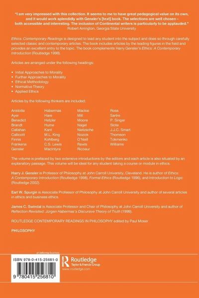 Harry J. Gensler, S.J.is Professor of Philosophy at John Carroll University, Cleveland. He is author of Ethics: A Contemporary Introduction (Routledge 1998), Formal Ethics (Routledge 1996), and Introduction to Logic (Routledge 2002). Earl W. Spurgin is Associate Professor of Philosophy at John Carroll University and author of several articles in ethics and business ethics. James C. Swindal is Associate Professor and Chair of Philosophy at John Carroll University and author of Reflection Revisited: Jürgen Habermas's Discursive Theory of Truth (1999).