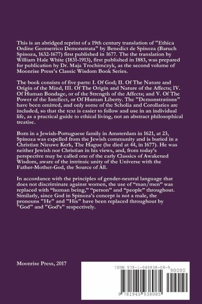 This is an abridged reprint in gender-neutral language of a 19th century translation of "Ethica Ordine Geometrico Demonstrata" by Benedict de Spinoza (Baruch Spinoza, 1632-1677) first published in 1677. The 1883 translation by William Hale White (1831-1913), was rendered gender-neutral by Dr. Maja Trochimczyk. This second volume of Moonrise Press's Classic Wisdom Book Series, consists of five parts: I. Of God; II. Of The Nature and Origin of the Mind, III. Of The Origin and Nature of the Affects; IV. Of Human Bondage, or of the Strength of the Affects. And V. Of The Power of the Intellect, or Of Human Liberty. Born in a Jewish-Portuguese family in Amsterdam in 1621, at 23, Spinoza was expelled from the Jewish community and is buried in a Christian church in The Hague (he died at 44, in 1677). He was neither Jewish nor Christian in his views, and, from today's perspective may be called one of the Classics of Awakened Wisdom, aware of the intrinsic unity of the Universe with God, the Source of all.