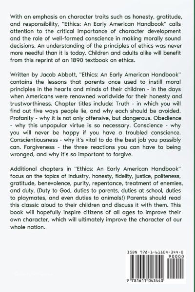 With an emphasis on character traits such as honesty, gratitude, and responsibility, "Ethics: An Early American Handbook" calls attention to the critical importance of character development and the role of well-formed conscience in making morally sound decisions. An understanding of the principles of ethics was never more needful than it is today. Children and adults alike will benefit from this reprint of an 1890 textbook on ethics. Written by Jacob Abbott, "Ethics: An Early American Handbook" contains the lessons that parents once used to instill moral principles in the hearts and minds of their children - in the days when Americans were renowned worldwide for their honesty and trustworthiness. Chapter titles include: Truth - in which you will find out five ways people lie, and why each should be avoided. Profanity - why it is not only offensive, but dangerous. Obedience - why this unpopular virtue is so necessary. Conscience - why you will never be happy if you have a troubled conscience. Conscientiousness - why it's vital to do the best job you possibly can. Forgiveness - the three reactions you can have to being wronged, and why it's so important to forgive. ¿Additional chapters in "Ethics: An Early American Handbook" focus on the topics of industry, honesty, fidelity, justice, politeness, gratitude, benevolence, purity, repentance, treatment of enemies, and duty. (Duty to God, duties to parents, duties at school, duties to playmates, and even duties to animals!) Parents should read this classic aloud to their children and discuss it with them. This book will hopefully inspire citizens of all ages to improve their own character, which will ultimately improve the character of our whole nation.