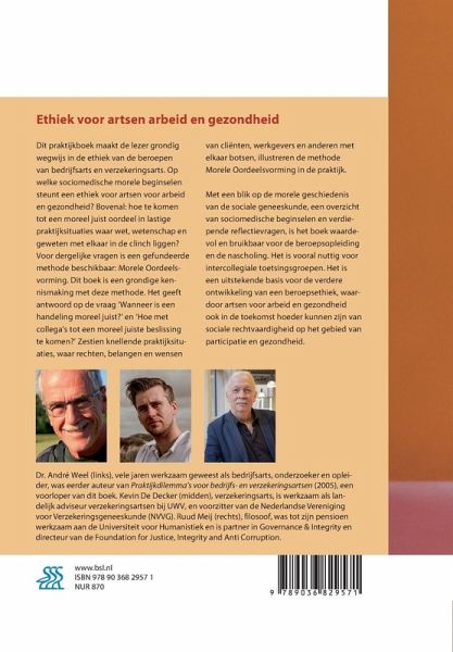 Dit praktijkboek maakt de bedrijfs- en verzekeringsartsen wegwijs in de beroepsethiek van hun eigen vak. Hoe komen zij tot een moreel juist oordeel? Op welke sociomedische morele beginselen steunt een ethiek voor artsen voor arbeid en gezondheid? Bovenal: hoe te komen tot een moreel juist oordeel in lastige praktijkvragen waar wet, wetenschap en geweten met elkaar in de clinch liggen? Voor dergelijke vragen is een gefundeerde methode beschikbaar: Morele Oordeelsvorming. Het boek is een grondige kennismaking met deze methode. Het geeft antwoord op de vraag 'Wanneer is een handeling moreel juist?' en 'Hoe met collega's tot een moreel juiste beslissing te komen?' Zestien knellende praktijksituaties, waar rechten, belangen en wensen van cliënten, werkgevers en anderen met elkaar botsen, illustreren de methode Morele Oordeelsvorming in de praktijk. Met een blik op de morele geschiedenis van de sociale geneeskunde, een overzicht van sociomedische beginselen en verdiepende reflectievragen, is het boek waardevol en bruikbaar voor de beroepsopleiding en de nascholing. Het is vooral nuttig voor intercollegiale toetsingsgroepen. Het is een uitstekende basis voor de verdere ontwikkeling van een beroepsethiek, waardoor artsen voor arbeid en gezondheid ook in de toekomst hoeder kunnen zijn van sociale rechtvaardigheid op het gebied van participatie en gezondheid. Dr. André Weel, vele jaren werkzaam geweest als bedrijfsarts, onderzoeker en opleider, was eerder auteur van Praktijkdilemma's voor bedrijfs- en verzekeringsartsen (2005), een voorloper van dit boek. Kevin De Decker, verzekeringsarts, is werkzaam als landelijk adviseur verzekeringsartsen bij UWV, en voorzitter van de NVVG. Ruud Meij, filosoof, was tot zijn pensioen werkzaam aan de Universiteit voor Humanistiek en is partner in Governance & Integrity en directeur van de Foundation for Justice, Integrity and Anti Corruption.