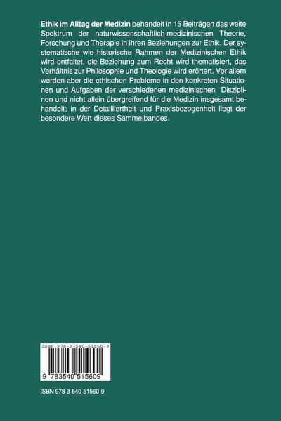 Ethik im Alltag der Medizin behandelt in 15 Beiträgen das weite Spektrum der naturwissenschaftlich-medizinischen Theorie, Forschung und Therapie in ihren Beziehungen zur Ethik. Der systematische wie historische Rahmen der Medizinschen Ethik wird entfaltet, die Beziehung zum Recht wird thematisiert, das Verhältnis zur Philosophie und Theologie wird erörtert. Vor allem werden aber die ethischen Probleme in den konkreten Situationen und Aufgaben der verschiedenen medizinischen Disziplinen behandelt und nicht allein übergreifend für die Medizin insgesamt; in dieser Detailliertheit und Praxisbezogenheit liegt der besondere Wert dieses Sammelbandes.